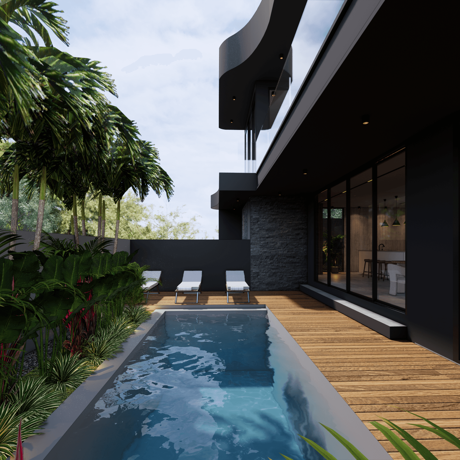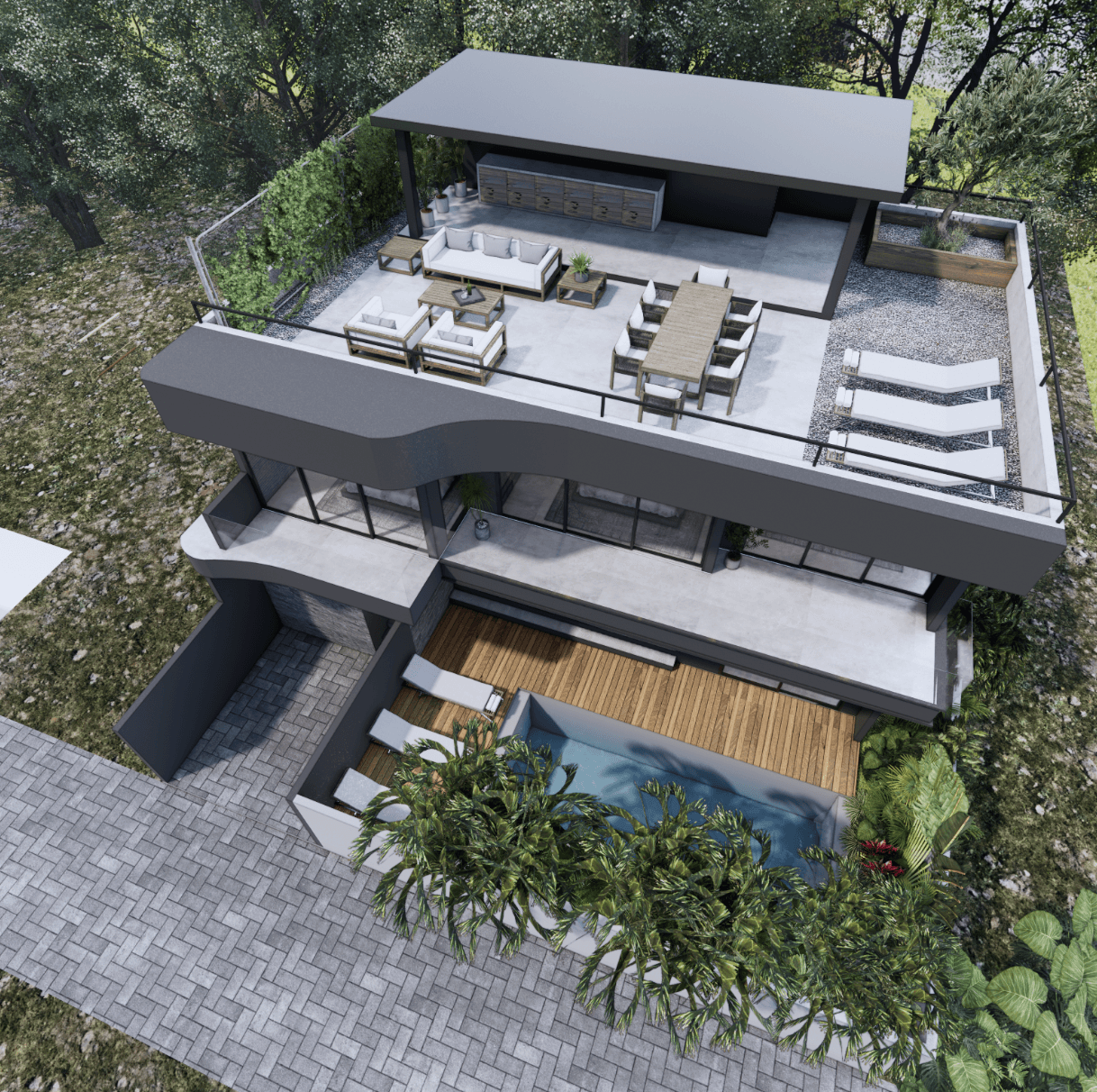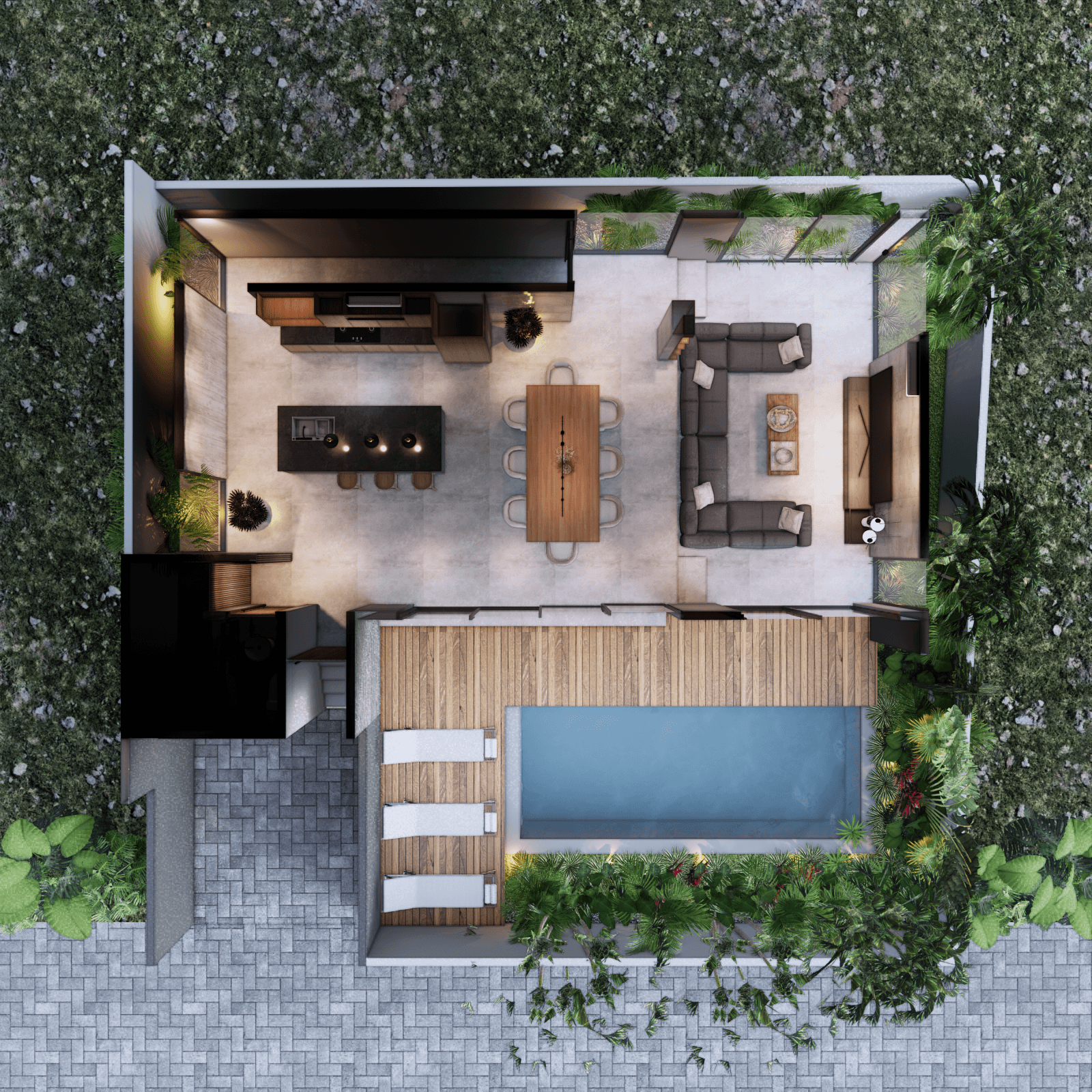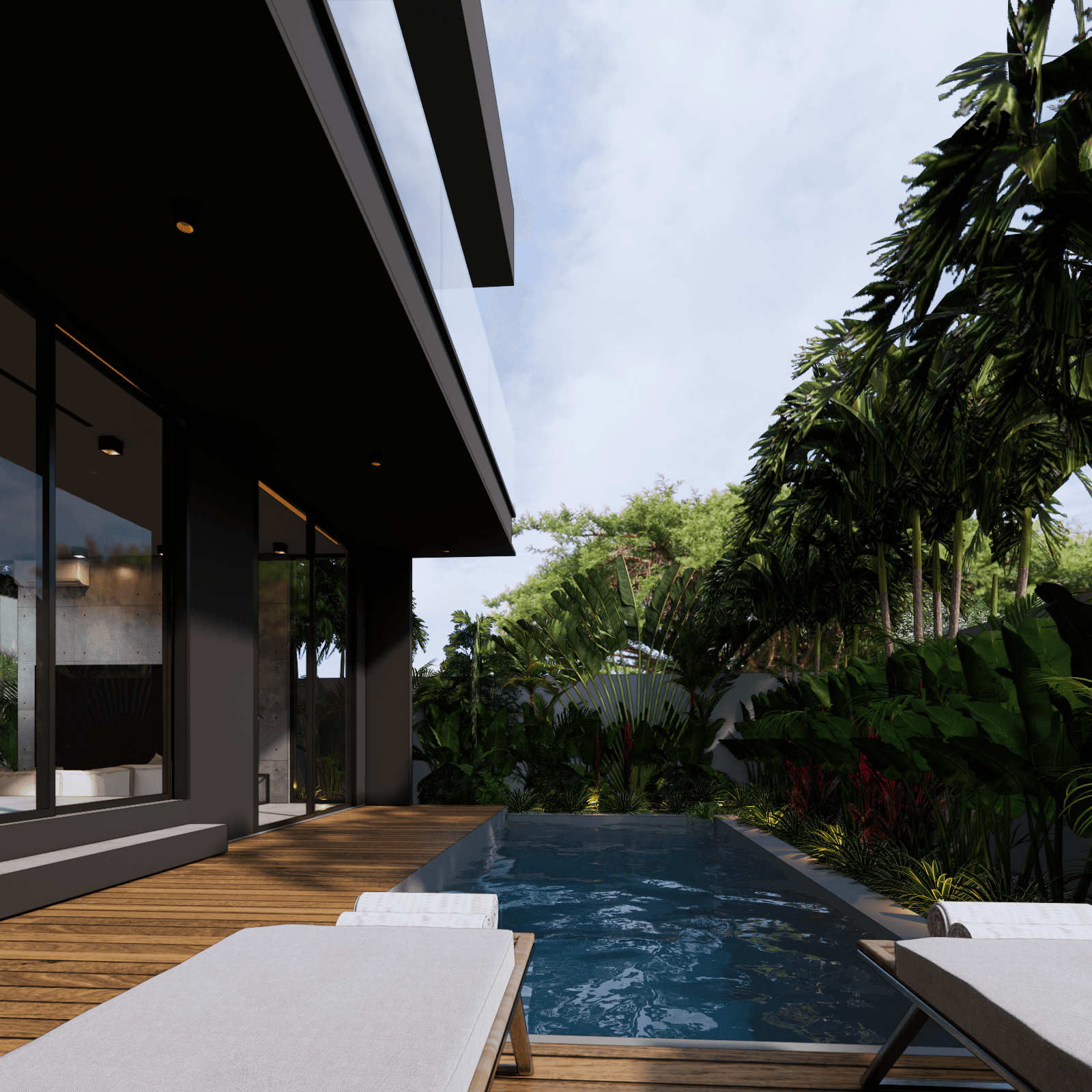 Black Villa is a Luxury 3 bedroom villa, with panoramic sea views across all 3 bedrooms as well as the rooftop. Built upon 225sqm of land, with 477sqm of build, boasting an extremely generous living area of 94sqm. The Ground floor consists of a car port with space for both car and bikes. Walking through the main door you enter the large open living area, with fully equipped kitchen with kitchen island, plus a large dining table to accommodate any event. There is also a communal toilet and storage room. The living area has a vast array of custom made decor, large sofa area with space to add in any extras you’d see fit. Opening the sliding doors to the side of the living area, you have access to the pool and decking area.