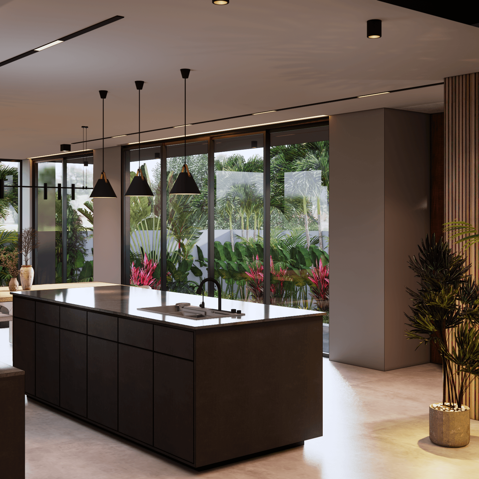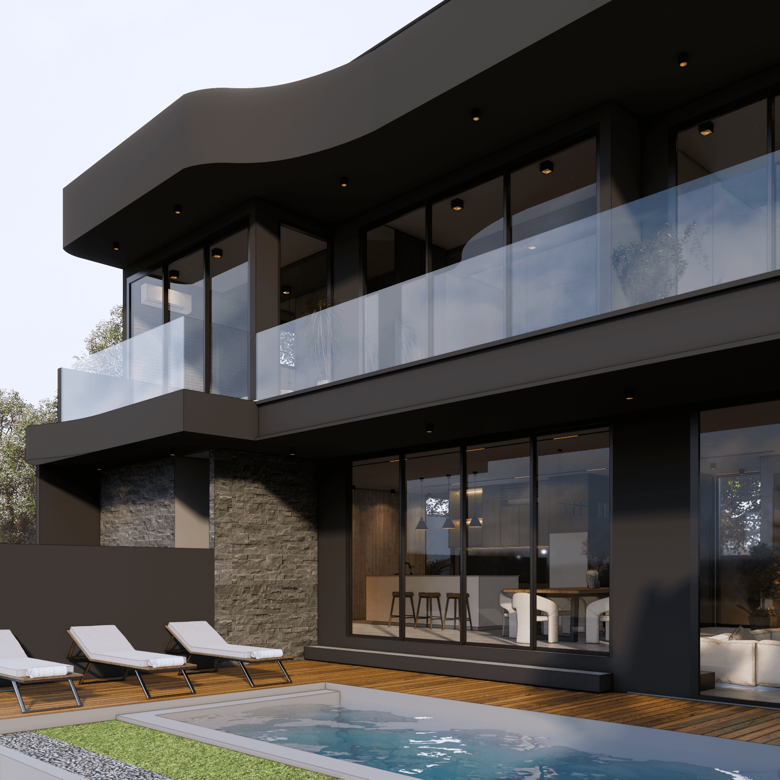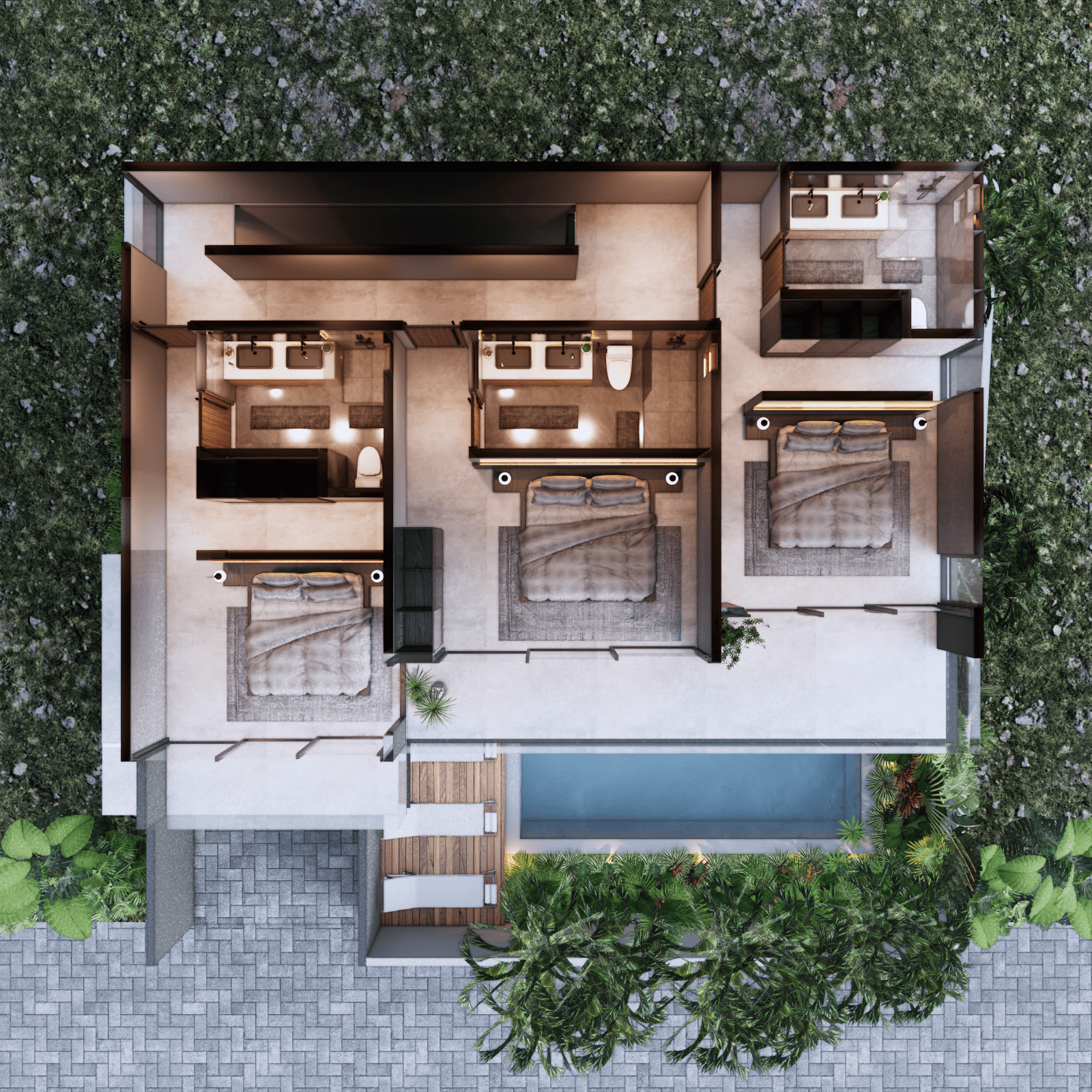 Black Villa is a Luxury 3 bedroom villa, with panoramic sea views across all 3 bedrooms as well as the rooftop. Built upon 225sqm of land, with 477sqm of build, boasting an extremely generous living area of 94sqm. The Ground floor consists of a car port with space for both car and bikes. Walking through the main door you enter the large open living area, with fully equipped kitchen with kitchen island, plus a large dining table to accommodate any event. There is also a communal toilet and storage room. The living area has a vast array of custom made decor, large sofa area with space to add in any extras you’d see fit. Opening the sliding doors to the side of the living area, you have access to the pool and decking area.