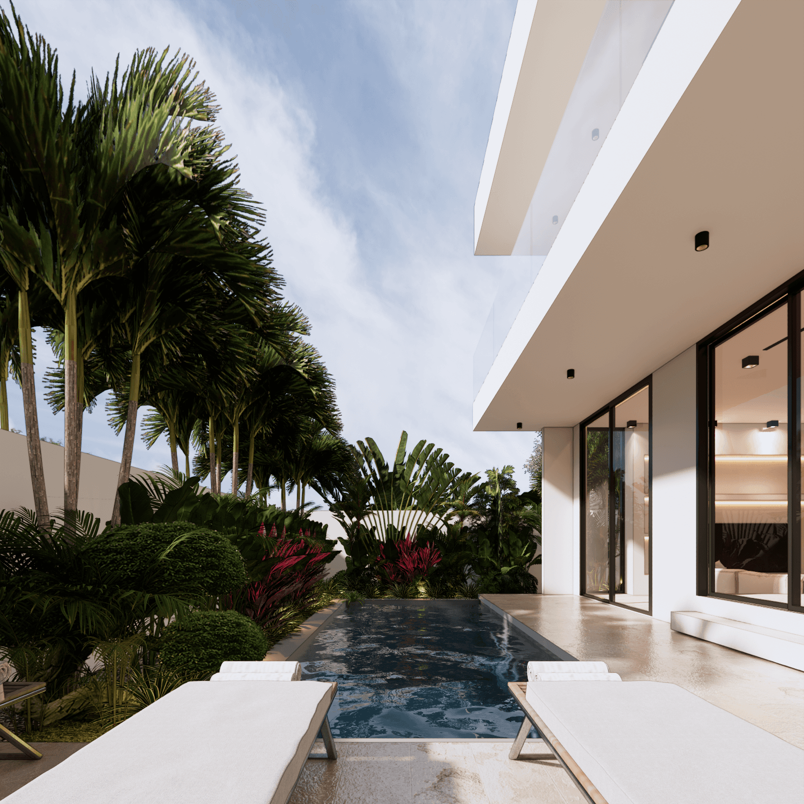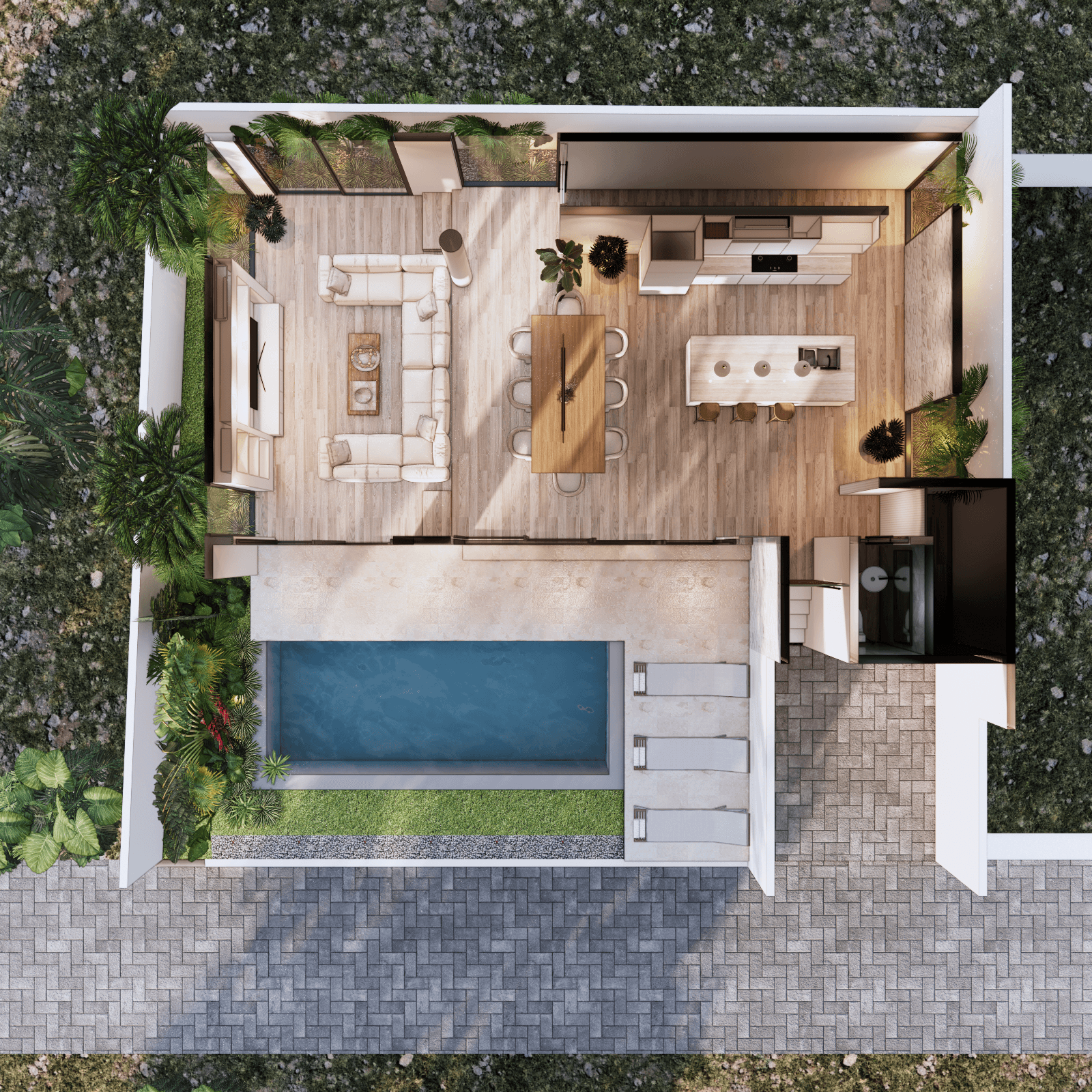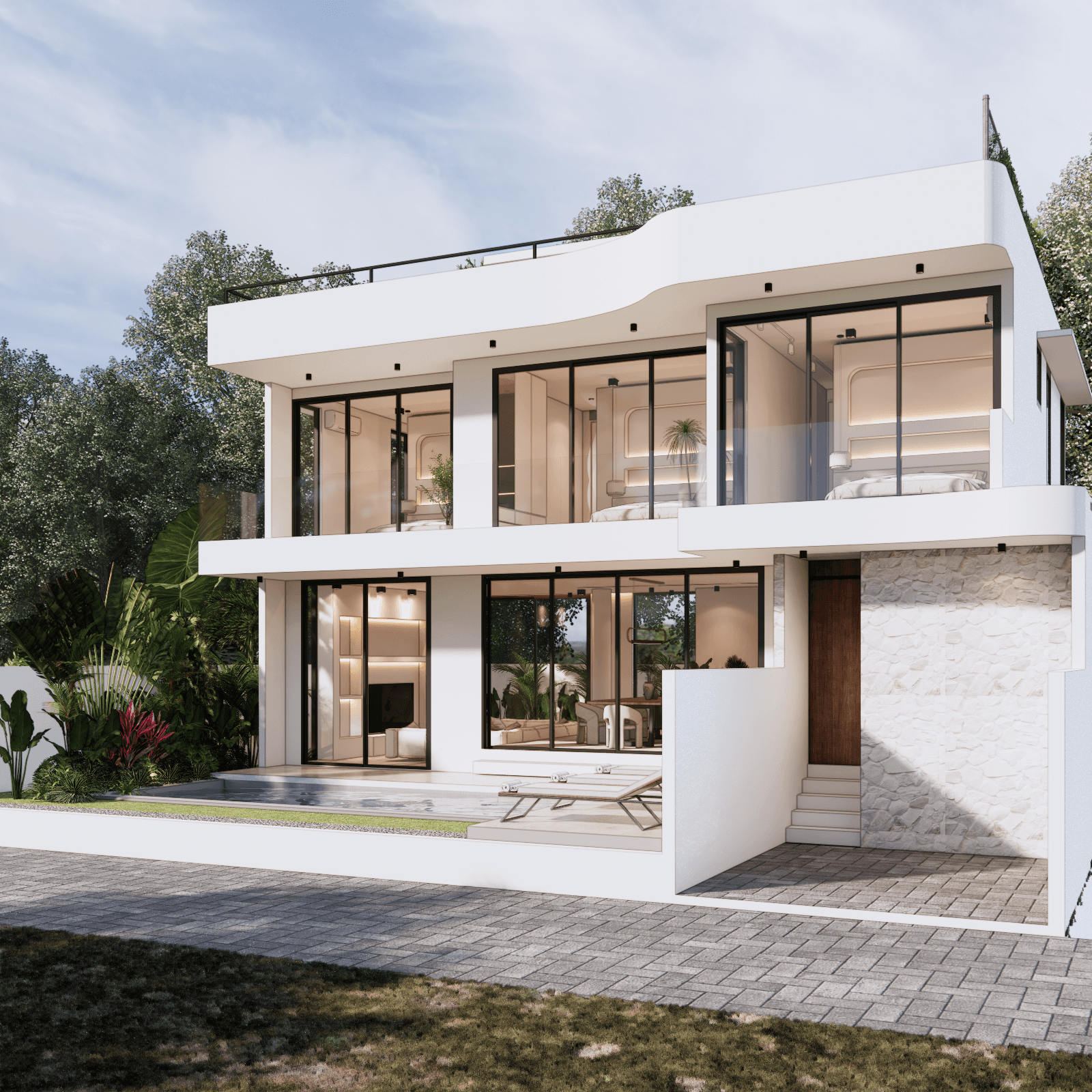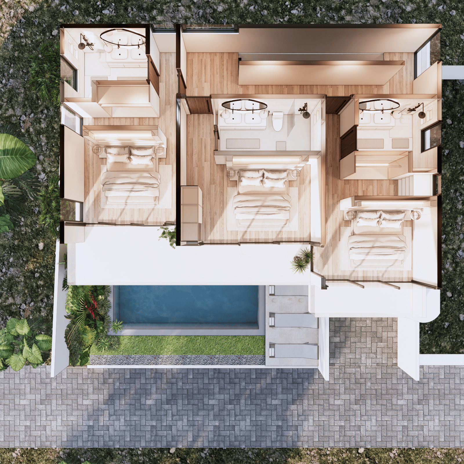 White Villa is a Luxury 3 bedroom villa, with panoramic sea views across all 3 bedrooms as well as the rooftop. Built upon 225sqm of land, with 477sqm of build, boasting an extremely generous living area of 94sqm. The Ground floor consists of a car port with space for both car and bikes. Walking through the main door you enter the large open living area, with fully equipped kitchen with kitchen island, plus a large dining table to accommodate any event. There is also a communal toilet and storage room. The living area has a vast array of custom made decor, large sofa area with space to add in any extras you’d see fit. Opening the sliding doors to the side of the living area, you have access to the pool and decking area.